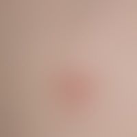 Drug reaction, fixed: suddenly appeared, for 3 days existing, erythematous, isolated, roundish, sharply defined plaques with central blisters of about 4-5 cm diameter on the abdomen of a 20-year-old female patient; probably the skin changes are due to the intake of paracetamol.